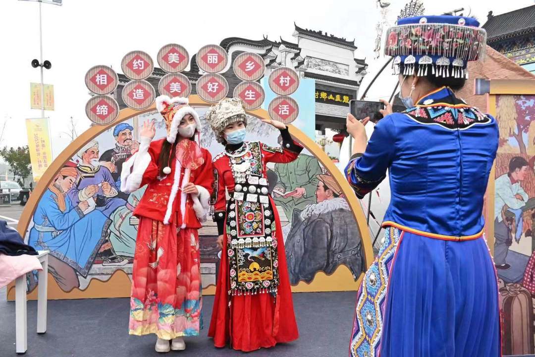 現(xiàn)場還設(shè)置了稻草藝術(shù)互動點、年畫換裝打卡點。稻草藝術(shù)互動點利用果實還原了鄉(xiāng)村豐收的景象,還可參與掰玉米比賽、軋制稻草人、搶南瓜比賽、撿雞蛋等環(huán)節(jié),在體驗農(nóng)事互動游戲的歡樂氛圍。設(shè)置“年畫打卡區(qū)”,挑選豐收主題的代表性年畫,還原背景,準備道具及服裝,沉浸式換裝打卡,讓你即刻“穿越”回畫中,喚醒對鄉(xiāng)村的記憶。如果線下趕集還不過癮,您還可以參與線上趕集,繼續(xù)觀看一場土里土氣又不失品質(zhì)品味的“沉浸式”帶貨直播。