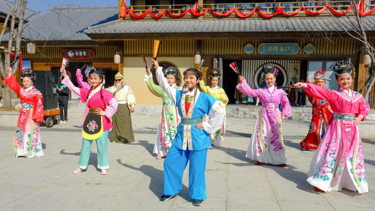 采風(fēng)團一行先后參觀東山問梅村文旅商街、主題度假客棧、問梅山莊宴會廳、稻田親子樂園以及鳳源里別墅等特色項目,在問梅村唐風(fēng)宋韻、移步換景的國風(fēng)景致里欣賞了經(jīng)典黃梅戲、國風(fēng)舞蹈等演藝節(jié)目,感受了一場優(yōu)雅的非遺文化體驗之旅。