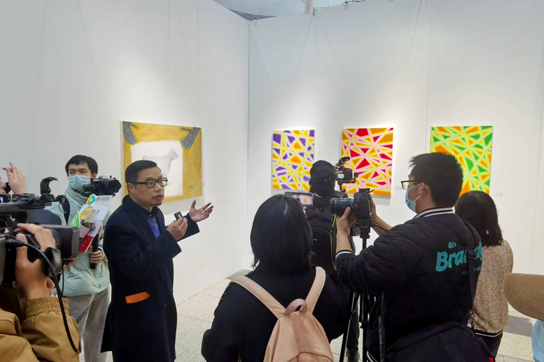 湖北美術(shù)學(xué)院繪畫學(xué)院院長徐文濤在專區(qū)現(xiàn)場為記者導(dǎo)覽