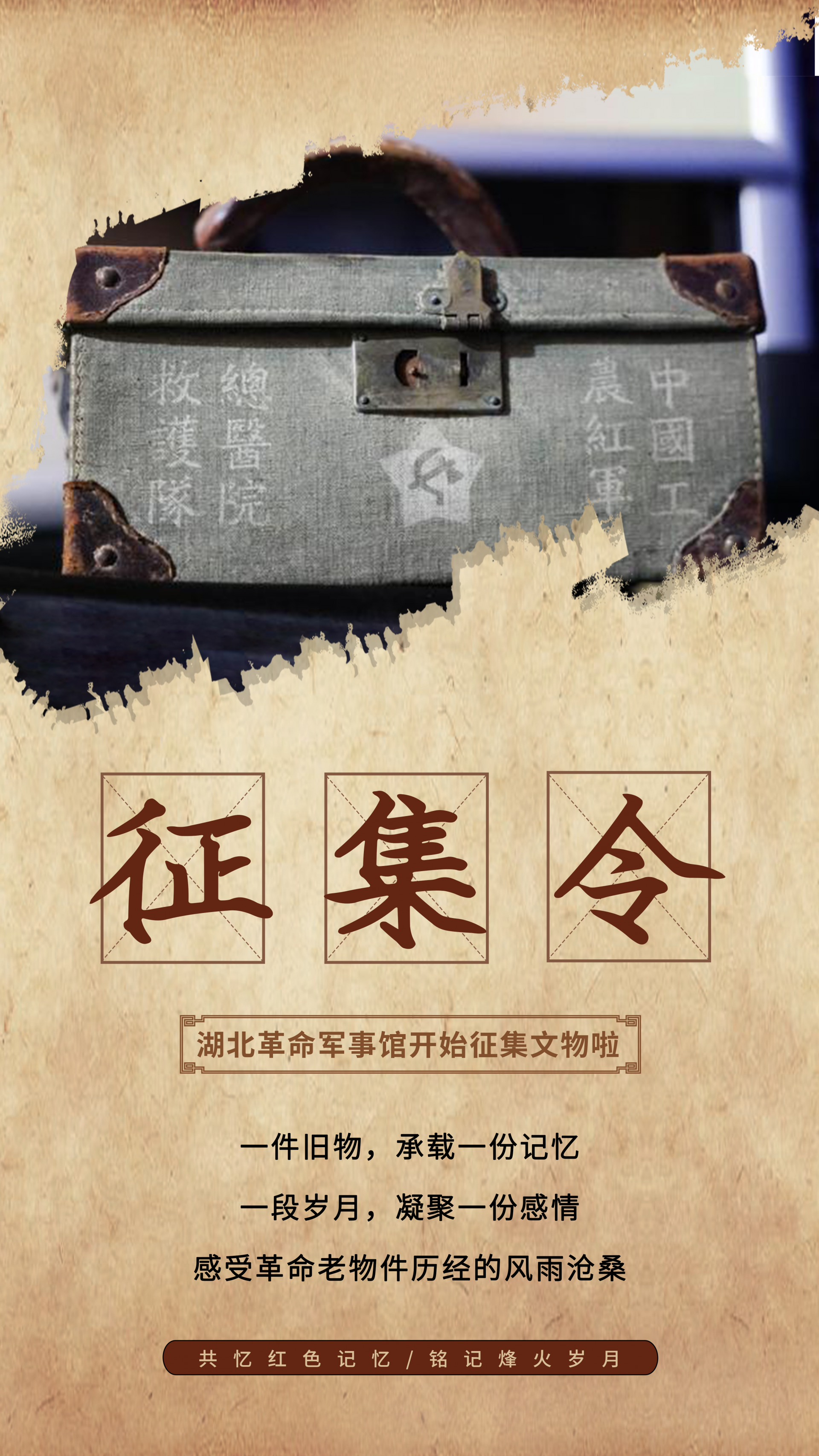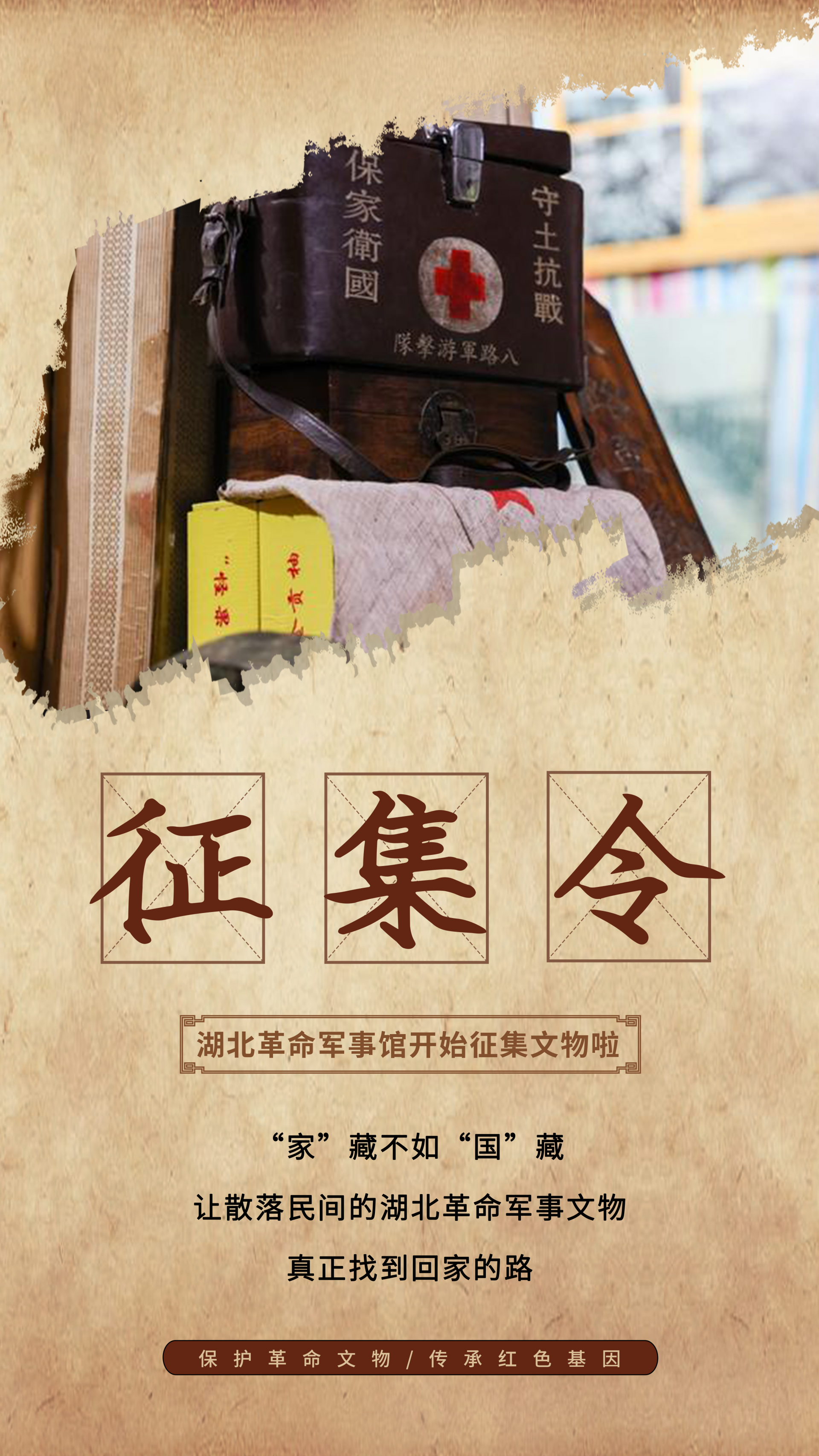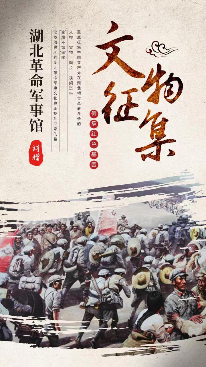 為貫徹落實(shí)習(xí)近平總書記關(guān)于傳承紅色基因的重要指示精神,高標(biāo)準(zhǔn)做好湖北革命軍事館籌建工作,集中展示中國共產(chǎn)黨在湖北領(lǐng)導(dǎo)武裝斗爭史、新中國國防建設(shè)史和新時(shí)代強(qiáng)軍興軍偉大實(shí)踐,延伸展示軍事歷史文化、兵要地志和武器裝備,精心打造傳承紅色基因、宣揚(yáng)強(qiáng)軍成就、普及國防教育的紅色殿堂,根據(jù)建館工作需要,湖北革命軍事館現(xiàn)面向社會(huì)各界公開征集革命文物(實(shí)物)史料。