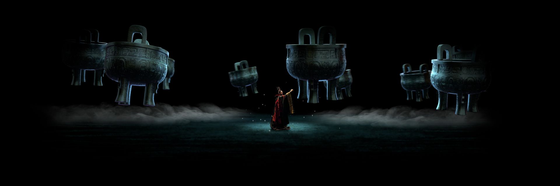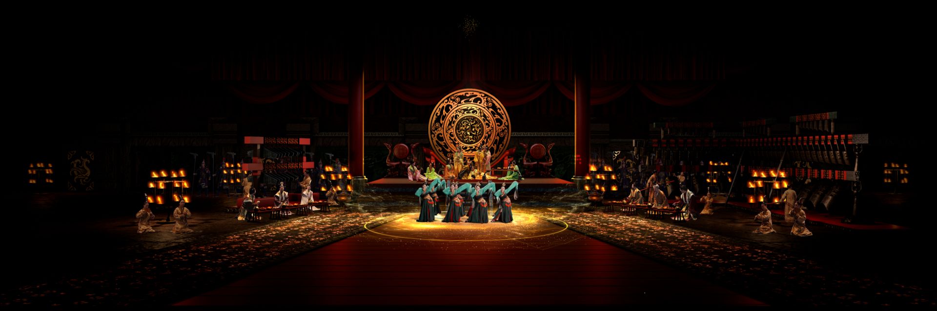 久遠的歷史,因全息舞臺凸顯出強大藝術(shù)感染力。楚巫的神秘,楚舞的優(yōu)雅,楚歌的委婉,匯聚成楚文化的動人魅力。楚國將士金戈鐵馬,楚宮歌女身姿婀娜,火神鳳凰神奇夢幻。經(jīng)過3D建模后呈現(xiàn)的編鐘、虎座鳳架鼓和楚劍等楚文化代表性文物極具視覺沖擊力。