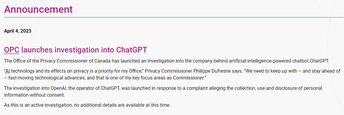 人民網(wǎng)訊 據(jù)加拿大廣播公司(CBC)當(dāng)?shù)貢r(shí)間4月4日報(bào)道,加拿大隱私專員辦公室(Office of the Privacy Commissioner,OPC)宣布,由于OpenAI公司涉嫌“未經(jīng)同意收集、使用和披露個(gè)人信息”,已經(jīng)對該公司展開調(diào)查。