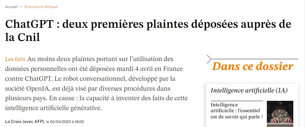 據(jù)法國(guó)《十字架報(bào)》報(bào)道,法國(guó)國(guó)家信息與自由委員會(huì)(CNIL)目前正在調(diào)查有關(guān)OpenAI公司旗下聊天機(jī)器人ChatGPT的投訴。圖片來(lái)源:法國(guó)《十字架報(bào)》官網(wǎng)