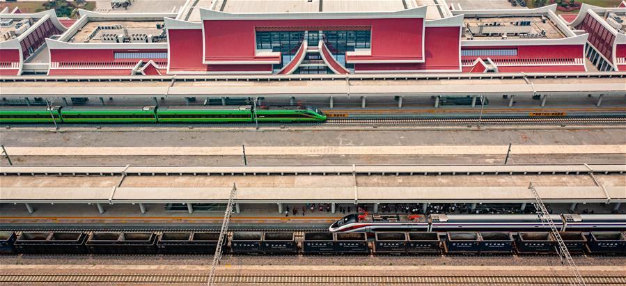 4月13日,“復興號”(上)、“瀾滄號”動車組列車??吭谥欣翔F路磨憨站(無人機照片)。新華社記者 胡超 攝