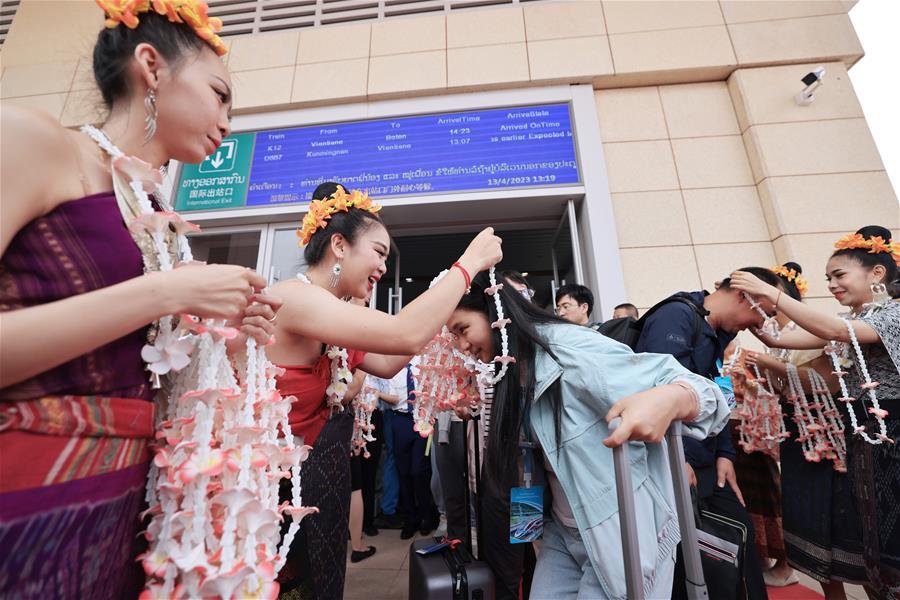 4月13日,在老撾萬象站,工作人員歡迎乘坐D887次國際旅客列車的旅客。新華社記者 邢廣利 攝