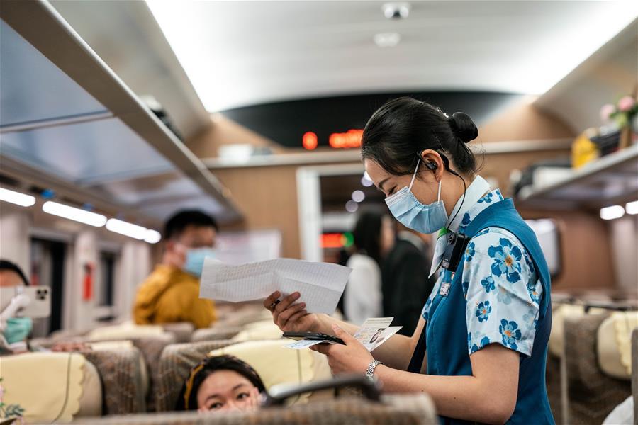 4月13日,首發(fā)列車乘務員在列車上查驗車票。新華社記者 胡超 攝