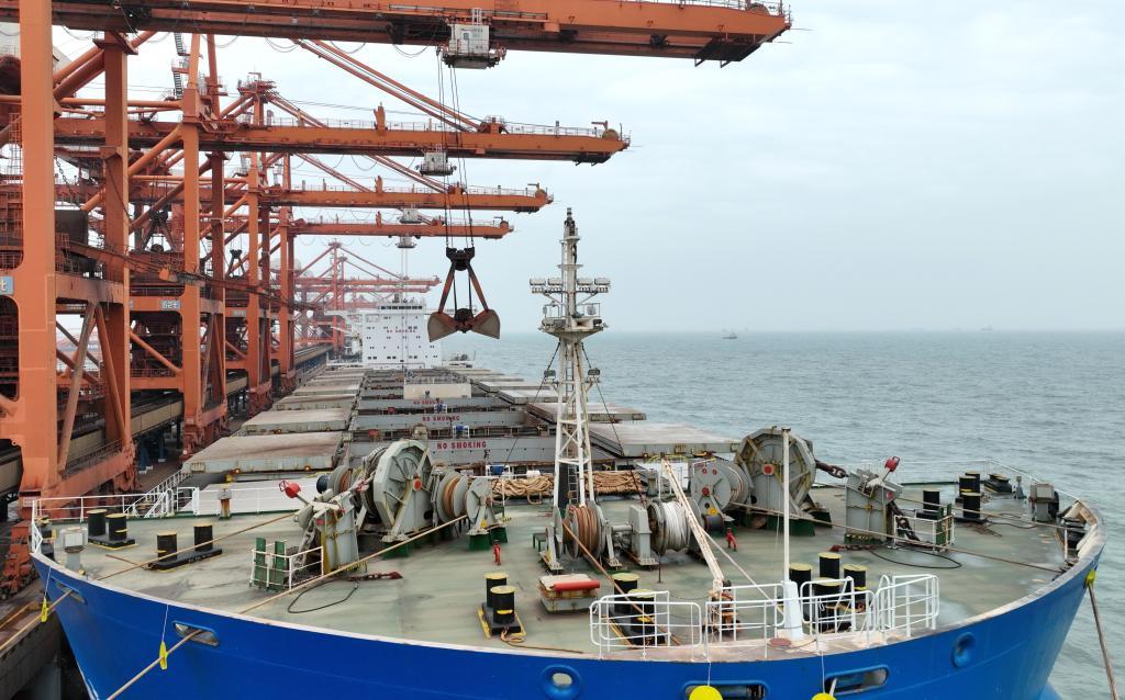 4月17日,一艘輪船靠泊在唐山港曹妃甸港區(qū)礦石碼頭(無人機(jī)照片)。(新華社記者楊世堯攝)