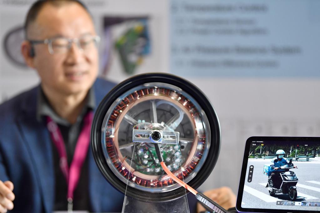 4月26日,在瑞士日內瓦,一名來自中國的發(fā)明家在第48屆日內瓦國際發(fā)明展上展示一款電驅系統(tǒng)。新華社記者連漪攝