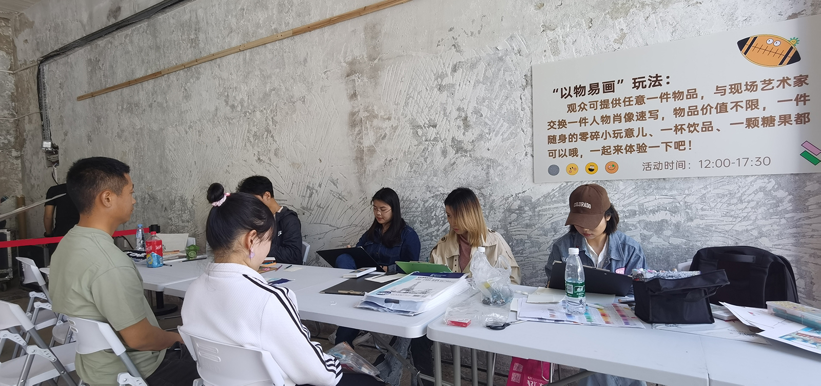 火星潮流藝術(shù)節(jié)現(xiàn)場發(fā)起“以物易畫”的公共藝術(shù)項(xiàng)目,觀眾可提供任意一件物品,與現(xiàn)場藝術(shù)家交換一件人物肖像速寫,物品價(jià)值不限,一件隨身的零碎小玩意兒、一杯飲品、一顆糖果都可以哦,一起來體驗(yàn)一下吧!