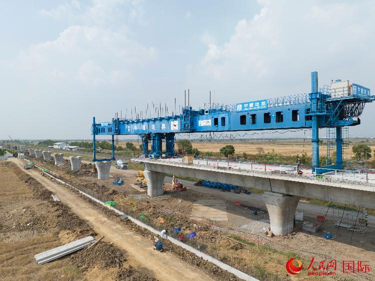 | 中國建筑工人在中泰鐵路項目4-3標(biāo)段進(jìn)行預(yù)制梁施工。人民網(wǎng)記者 孫廣勇攝 |