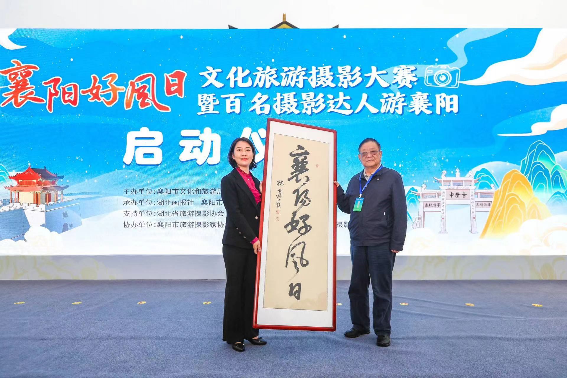 啟動(dòng)儀式上,全國(guó)旅游攝影協(xié)會(huì)聯(lián)合會(huì)主席、江西省旅游攝影協(xié)會(huì)會(huì)長(zhǎng)萬(wàn)建明發(fā)言:“我們用相機(jī)定格襄陽(yáng)的人文雅韻、山水之美,以旅游+攝影,攝影促旅游的方式倡導(dǎo)廣大游客愛(ài)上襄陽(yáng),玩轉(zhuǎn)襄陽(yáng),助推襄陽(yáng)都市圈的發(fā)展建設(shè)?!?/span>中國(guó)攝影家協(xié)會(huì)會(huì)員、中國(guó)書(shū)法家協(xié)會(huì)會(huì)員、湖北省政府原副省長(zhǎng)韓忠學(xué)向襄陽(yáng)市文旅局局長(zhǎng)袁曉寧贈(zèng)送書(shū)法作品《襄陽(yáng)好風(fēng)日》,生動(dòng)演繹了攝影藝術(shù)與書(shū)法藝術(shù)聯(lián)姻的精彩瞬間。