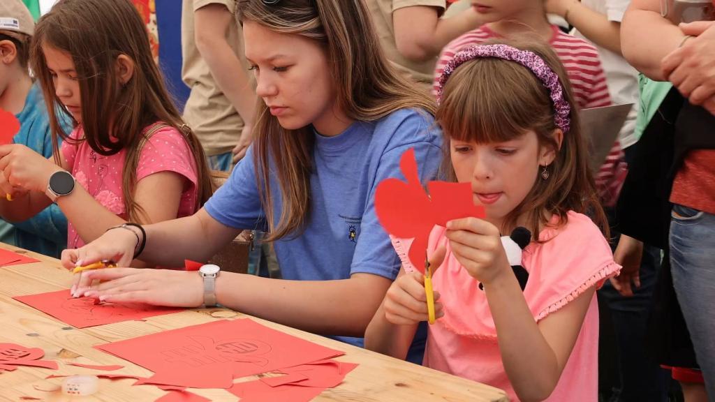中國(guó)結(jié)、紅燈籠、福字貼……帶有濃濃中國(guó)風(fēng)的帳篷內(nèi)人頭攢動(dòng),大人和孩子們一起投入地體驗(yàn)剪紙、十二生肖涂色、書法等中國(guó)傳統(tǒng)文化。