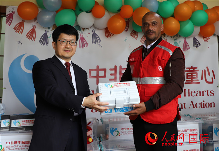 | 李健大使向孤兒院負責人移交捐贈物資。人民網(wǎng)記者 王傳寶攝 |