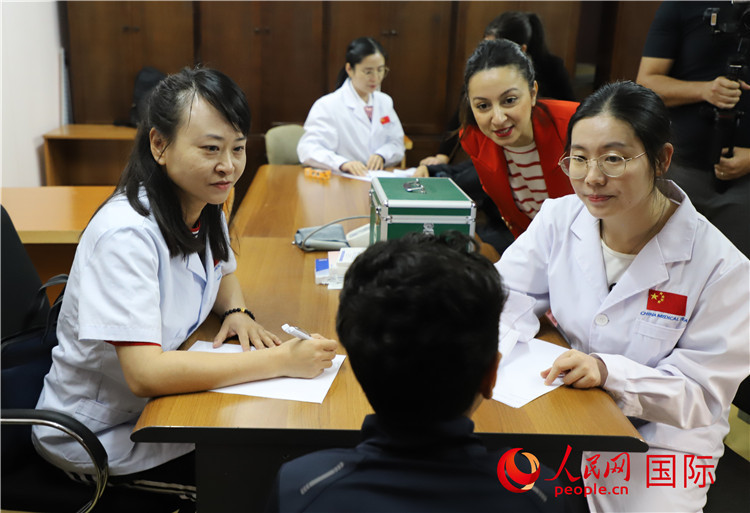 | 中國援阿醫(yī)療隊員為孤兒院兒童義診。人民網(wǎng)記者 王傳寶攝 |