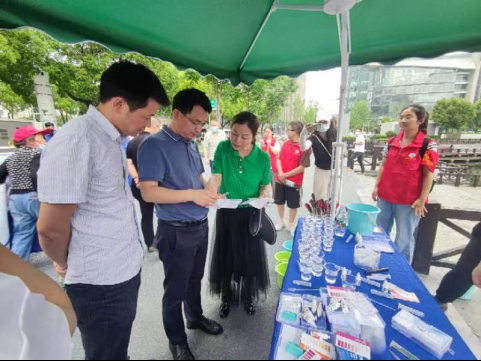 在“測測水多清”“動動岸更美”“我也來巡河”“我也來學(xué)習(xí)”等主題宣傳環(huán)節(jié),身穿藍(lán)色馬甲的新華街道河湖長和紅色馬甲的大學(xué)生黨員志愿者帶領(lǐng)居民在機(jī)器蕩子湖邊測試機(jī)器蕩子湖的水質(zhì)。