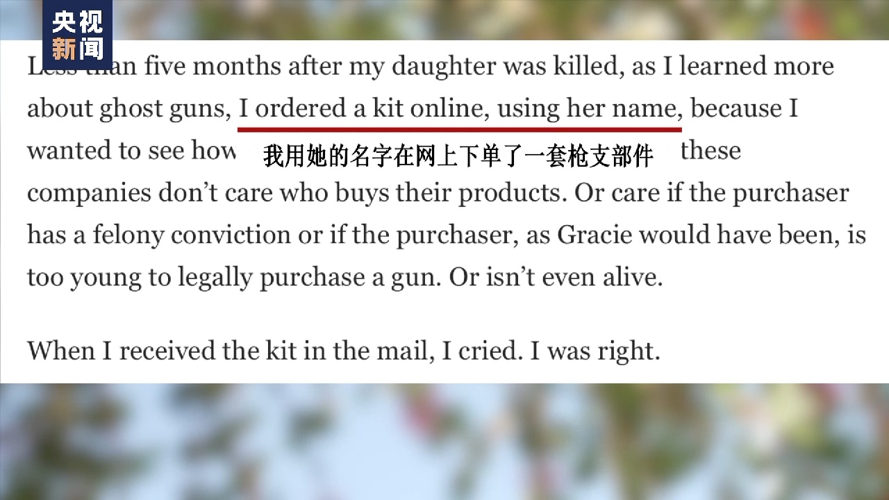 槍擊案發(fā)生不到五個(gè)月后,遇害者之一格雷斯·穆爾伯格的父親用已逝女兒的名字成功訂購(gòu)到一套“幽靈槍”的槍支部件,他在《華盛頓郵報(bào)》分享了這個(gè)經(jīng)歷,以此揭露“幽靈槍”行業(yè)的黑暗。