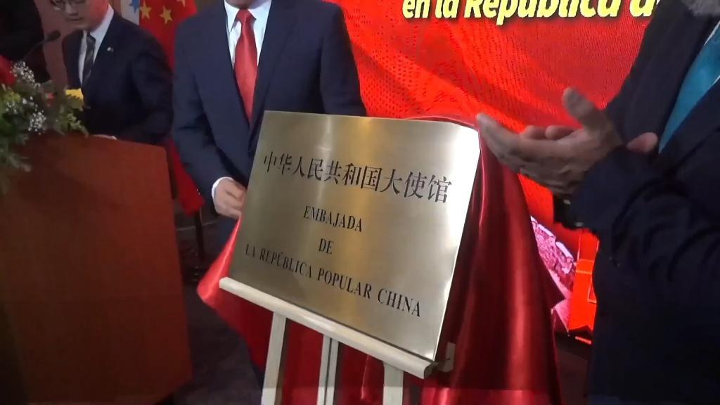 儀式現(xiàn)場(chǎng)先后奏響中洪兩國(guó)國(guó)歌。隨后中國(guó)駐洪都拉斯使館臨時(shí)代辦于波與洪外交部長(zhǎng)雷納共同為使館揭牌。
