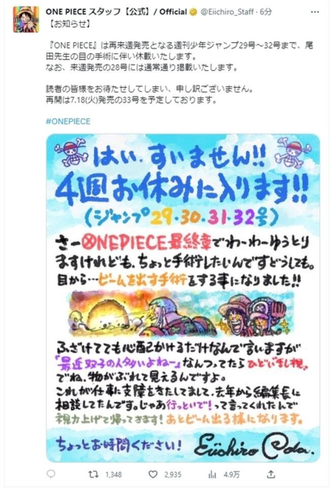 其官網(wǎng)還發(fā)布了尾田榮一郎在自己的手繪插畫上寫的“請假條”。他表示:“非常抱歉,我將休息四周時間?!逗胶M酢冯m然已經進入終章,但由于眼睛的散光很嚴重,看東西時出現(xiàn)重影,所以需要做個手術。請給我一些時間(修養(yǎng)一下)?!?/p>