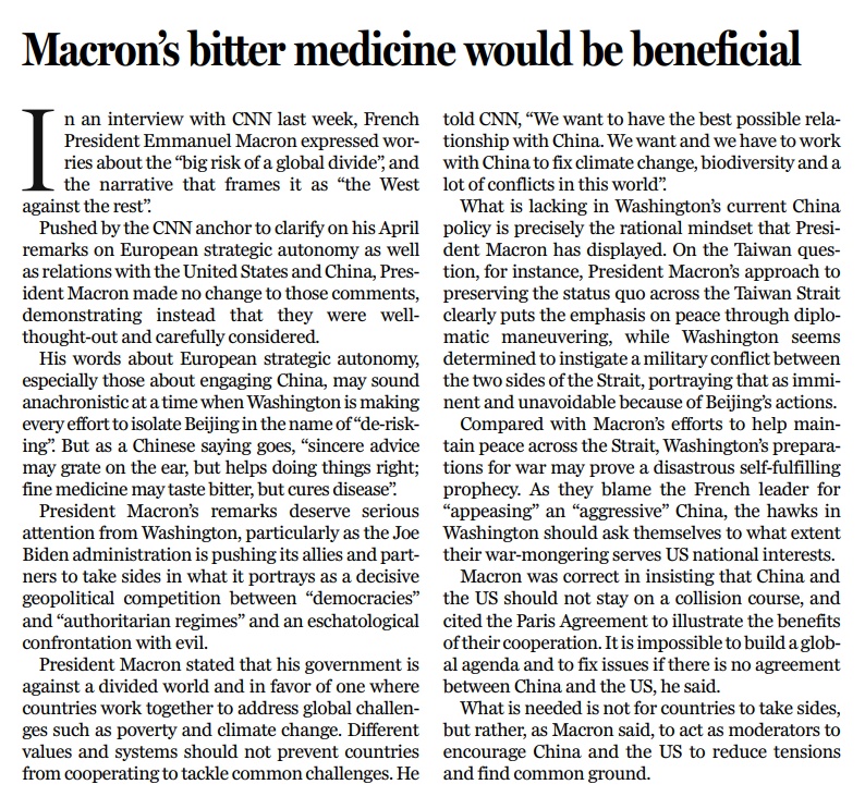 美國(guó)目前對(duì)華政策所缺乏的,恰恰是馬克龍總統(tǒng)所表現(xiàn)出來(lái)的理性。例如,在臺(tái)灣問題上,馬克龍總統(tǒng)支持維持現(xiàn)狀,強(qiáng)調(diào)通過(guò)外交手段維護(hù)和平,而華盛頓似乎決意挑起海峽兩岸的軍事沖突,并將其描述為迫在眉睫和不可避免的。與馬克龍有助維護(hù)臺(tái)海和平的努力相比,華盛頓的戰(zhàn)爭(zhēng)準(zhǔn)備可能是災(zāi)難性的。當(dāng)他們指責(zé)法國(guó)領(lǐng)導(dǎo)人“安撫”中國(guó)時(shí),華盛頓鷹派應(yīng)該捫心自問,他們的好戰(zhàn)行為在多大程度上符合美國(guó)的國(guó)家利益。