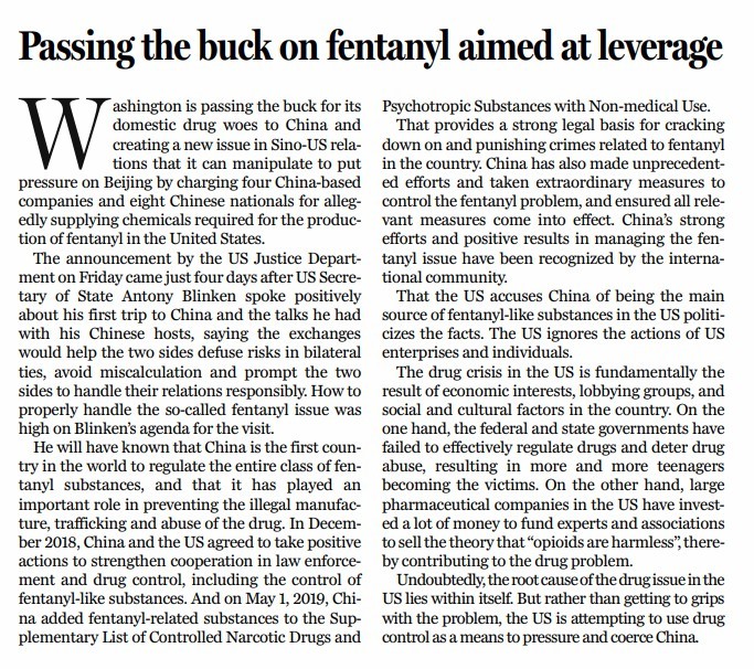 布林肯應(yīng)該知道,中國(guó)是全球首個(gè)正式整類(lèi)列管芬太尼類(lèi)物質(zhì)的國(guó)家,為防范其非法制販及濫用發(fā)揮了重要作用。2018年12月,中美雙方同意采取積極行動(dòng)加強(qiáng)執(zhí)法、禁毒等合作,包括對(duì)芬太尼類(lèi)物質(zhì)的管控。2019年5月1日,中國(guó)將芬太尼類(lèi)物質(zhì)列入《非藥用類(lèi)麻醉藥品和精神藥品管制品種增補(bǔ)目錄》,為打擊和懲治涉芬太尼犯罪提供了強(qiáng)有力的法律依據(jù)。中方以雷霆之勢(shì)治理芬太尼問(wèn)題,竭盡全力確保各項(xiàng)措施落實(shí)到位。中國(guó)所作的努力以及取得的積極成果獲得了國(guó)際社會(huì)的高度肯定。