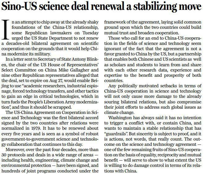 美國國會數(shù)名共和黨議員日前致函國務(wù)卿布林肯,要求不再續(xù)簽即將于8月27日到期的《中美科技合作協(xié)定》。此舉意在重創(chuàng)本就搖搖欲墜的中美關(guān)系,可謂居心叵測。