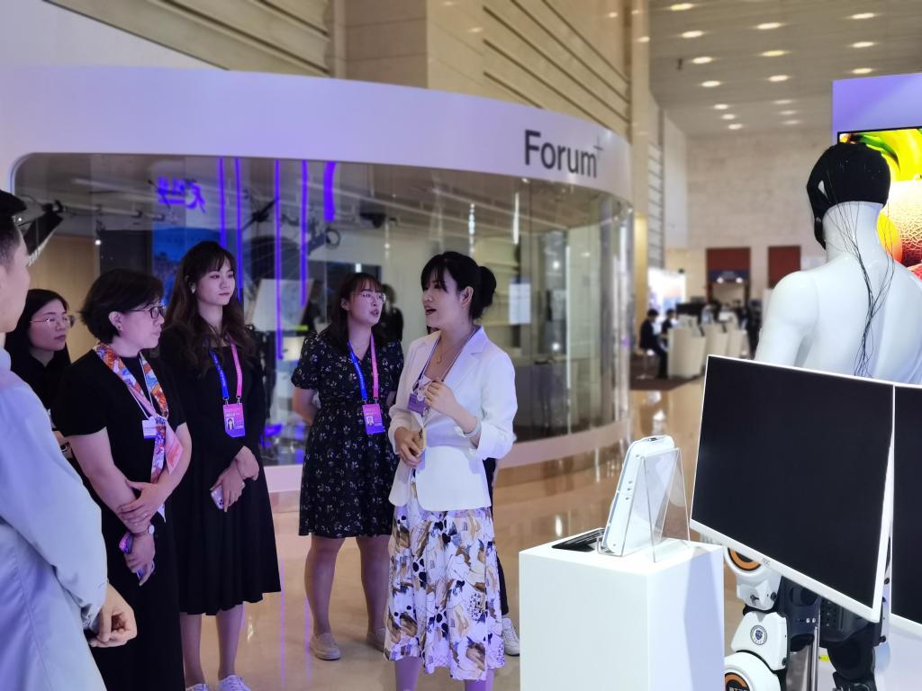 在天開高教科創(chuàng)園陳列區(qū),講解員正在講解高科技產(chǎn)品。新華社記者劉惟真 攝
