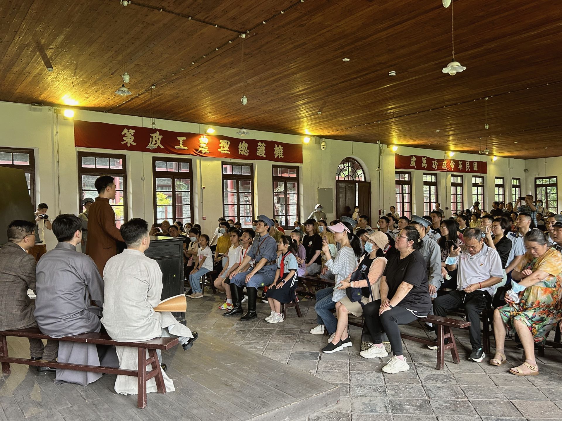 一幕幕歷史場景在革命舊址中鋪陳開來,觀眾們化身為“農(nóng)講所學(xué)員”“中共五大代表”等, 全程參與其中,穿越時空和革命先輩進行歷史的對話。