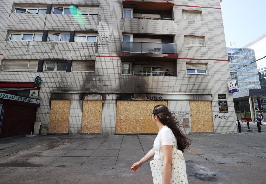 6月30日,在法國上塞納省楠泰爾市,一家銀行所在的建筑被縱火破壞。新華社記者高靜攝