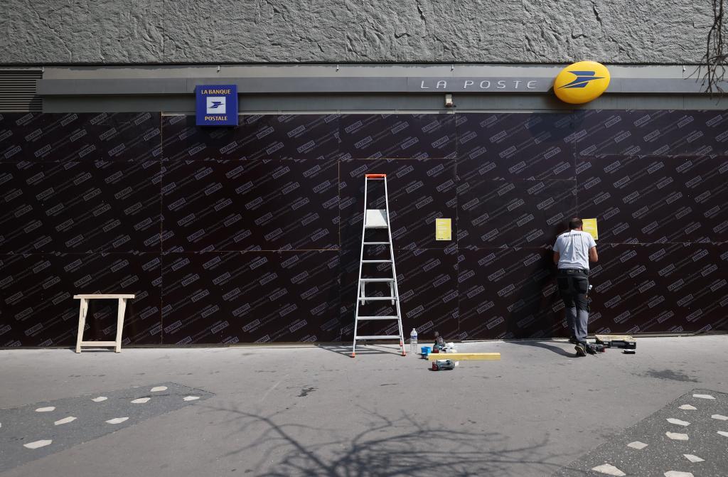 6月30日,在法國上塞納省楠泰爾市,工作人員為一家郵局加裝防護(hù)板。新華社記者高靜攝