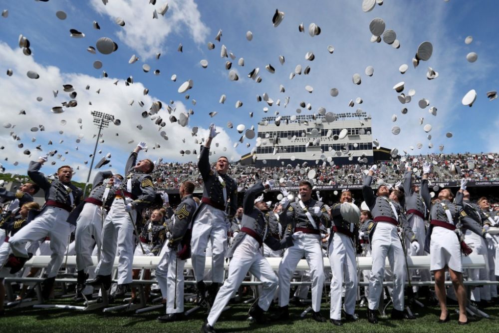 2017年5月27日,在位于美國紐約州北部的西點(diǎn)軍校,學(xué)員將帽子扔向空中慶祝畢業(yè)。新華社記者王迎攝