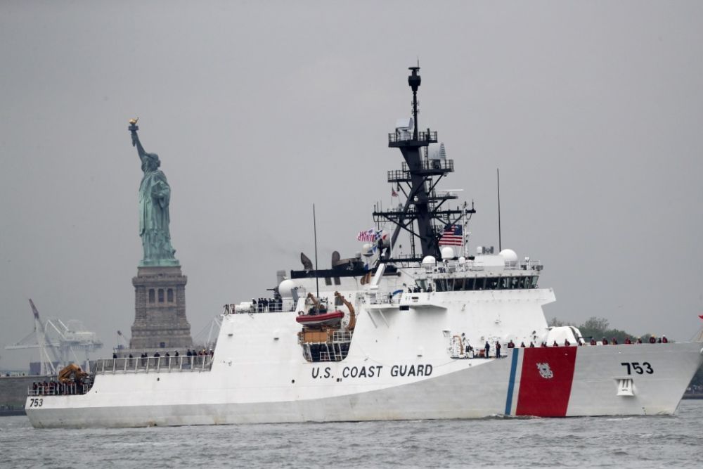 2017年5月24日,在美國紐約,美國海岸警衛(wèi)隊(duì)“漢密爾頓號”巡邏艦參加紐約艦隊(duì)周艦船巡游活動。新華社記者王迎攝