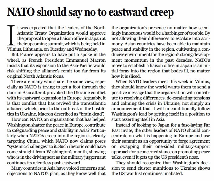 當(dāng)北約領(lǐng)導(dǎo)人本周會晤時,他們應(yīng)該知道,世界希望他們發(fā)出積極信息,為解決分歧、緩和緊張和平息烏克蘭危機做出貢獻,而非無條件追隨決定向烏克蘭提供集束彈藥的華盛頓,繼續(xù)擴大戰(zhàn)火,甚至東進亞太,引發(fā)新的地區(qū)動蕩與紛爭。我們在此奉勸北約,早日收手,回頭是岸,不要在搞亂了歐洲之后再搞亂亞洲,搞亂全世界。