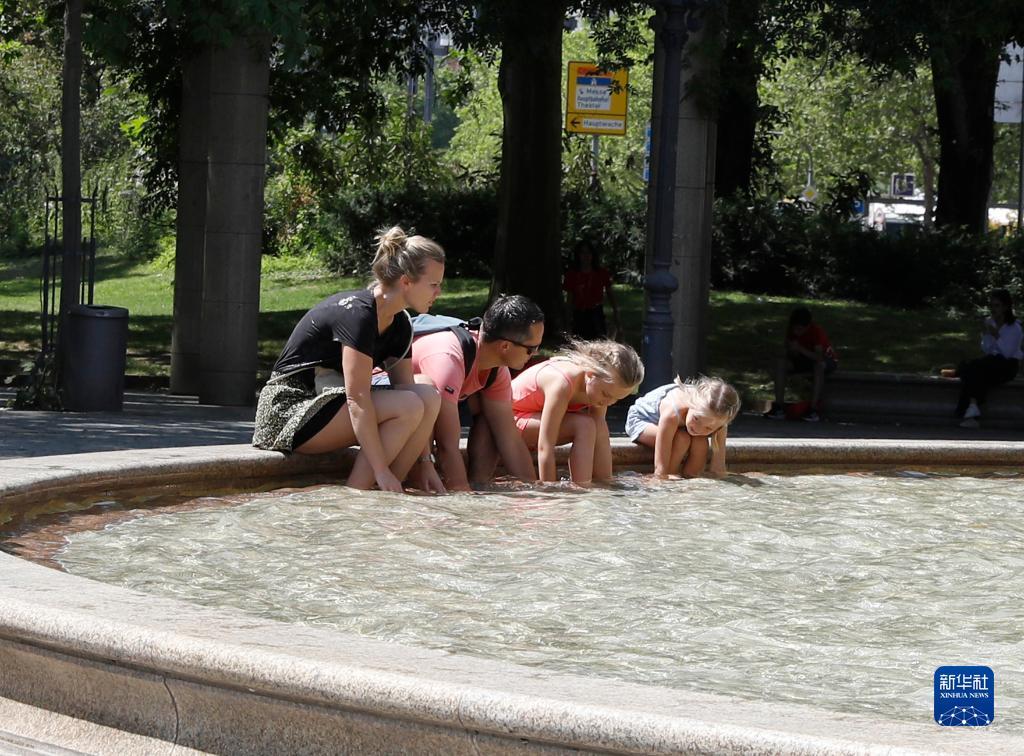 7月8日,人們?cè)诘聡?guó)法蘭克福的一處噴泉玩水。近日,德國(guó)法蘭克福逐漸迎來(lái)暑熱天氣。新華社記者 張帆 攝