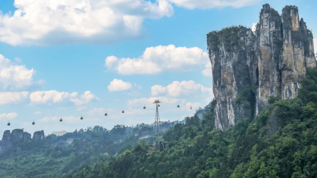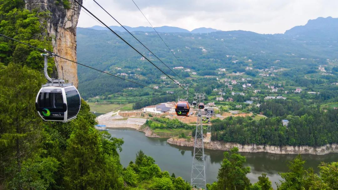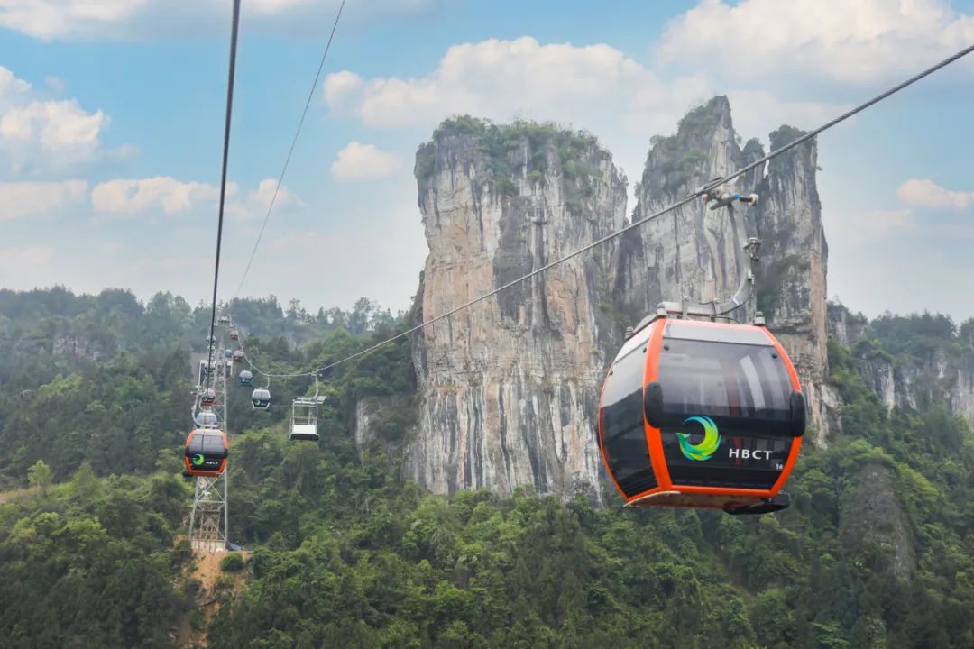景區(qū)跨清江索道全長(zhǎng)1056米,采用了國(guó)際上先進(jìn)的單線循環(huán)脫掛式八人吊廂,上下高差156米,運(yùn)行速度最快6米/秒,設(shè)計(jì)運(yùn)載量每小時(shí)2700人。乘坐時(shí)既可以仰望紅花峰林,也可俯瞰清江河谷秀美風(fēng)光。
