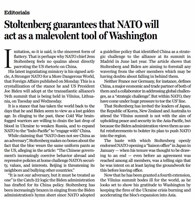 他最近的模仿是于7月10日在《外交事務(wù)》上發(fā)表題為《更強(qiáng)大的北約,應(yīng)對(duì)更危險(xiǎn)的世界》的署名文章,字里行間透露了他和美國(guó)總統(tǒng)拜登在北約峰會(huì)上的立場(chǎng)。為了固守過(guò)去,這些頭腦昏昏的冷戰(zhàn)“斗士”寧愿讓烏克蘭流盡最后一滴血,以削弱俄羅斯,并將北約擴(kuò)大到所謂“印太”地區(qū),遏制中國(guó)。