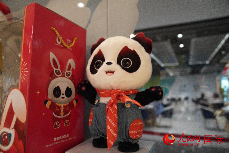 | 成都大運(yùn)會(huì)主媒體中心官方特許商品零售店的“蓉寶”公仔。人民網(wǎng) 周琳佳攝 |