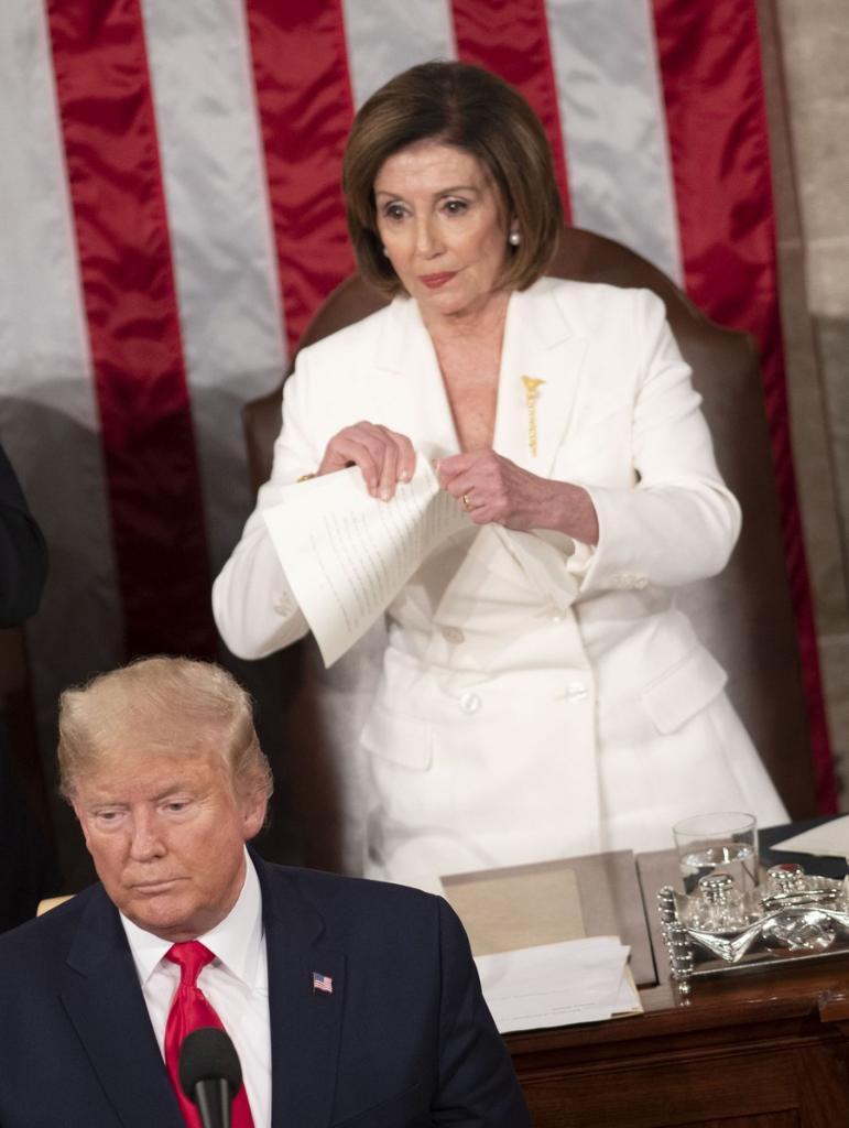 2020年2月4日,在美國首都華盛頓,時任美國總統(tǒng)特朗普(前)在國會發(fā)表國情咨文演講后,時任國會眾議院議長、民主黨人佩洛西將講稿副本撕毀。(新華社記者劉杰攝)