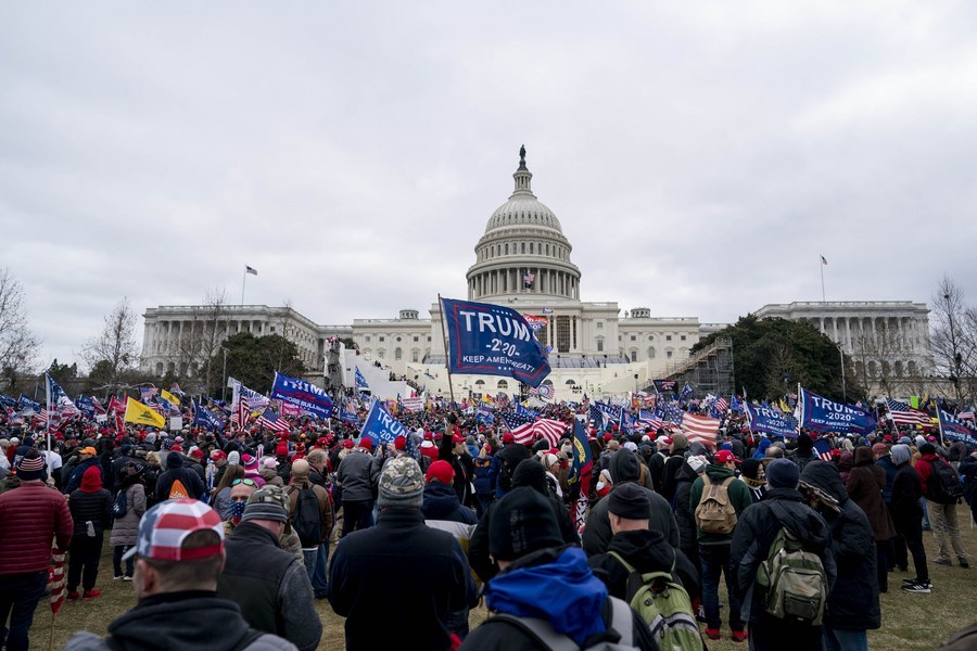 2021年1月6日,在美國首都華盛頓,時任美國總統(tǒng)特朗普的支持者舉行示威游行。(新華社記者劉杰攝)