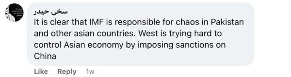 還有網友留言說:“國際貨幣基金組織對巴基斯坦和其他亞洲國家的混亂負有責任,這一點再清楚不過了。西方試圖通過制裁中國來控制亞洲經濟?!?/p>