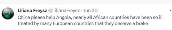 網友利利安娜·弗賴斯直呼:“中國請幫助安哥拉,幾乎所有非洲國家都忍受過歐洲國家的糟糕對待,它們該迎來轉機了?!?/p>