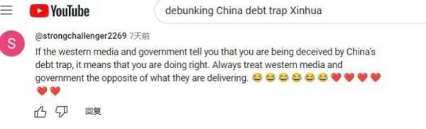 網友“強力挑戰(zhàn)者2269”直言:“如果西方政府和媒體告訴你,你陷入了中國的‘債務陷阱’,那證明你做對了。對待西方媒體和政府宣傳的信息,你得反著看。”