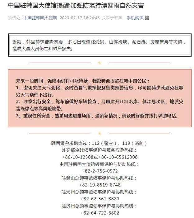 未來(lái)一段時(shí)間,強(qiáng)降雨仍有可能持續(xù),我館特此提醒在韓中國(guó)公民: