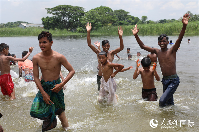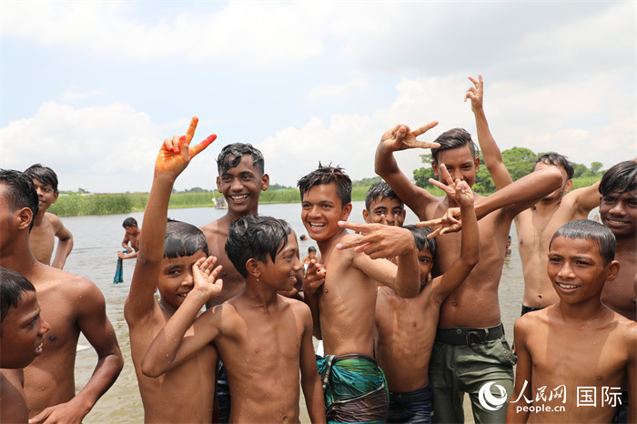 在孟加拉國首都達(dá)卡東南郊區(qū)的達(dá)舍爾甘地村,一片片池塘和河流形成密布的水系,當(dāng)?shù)睾⒆觽儽M情地跳進(jìn)清澈的河水中嬉戲玩耍??吹接浾叩溺R頭,他們興奮地展示著自己的泳技,有的展臂向前游動(dòng)、有的騰身躍入水中,一大群孩子聚在鏡頭前,齊聲高喊:“我愛游泳,我愛茍加芮Gojaria河,我愛中國?!?/p>