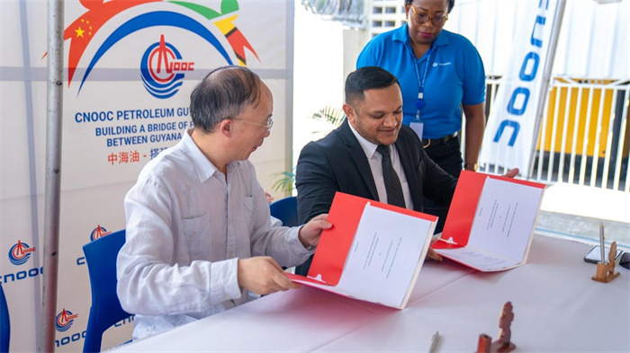 圭亞那自然資源部部長巴拉特與中海油圭亞那有限公司總經(jīng)理劉曉祥在協(xié)議上簽字。中海油圭亞那有限公司供圖