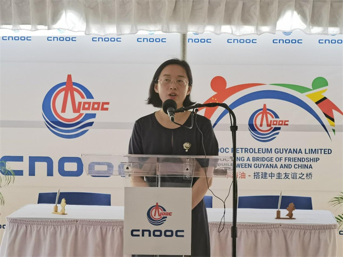 中國駐圭亞那大使郭海燕致辭。中海油圭亞那有限公司供圖