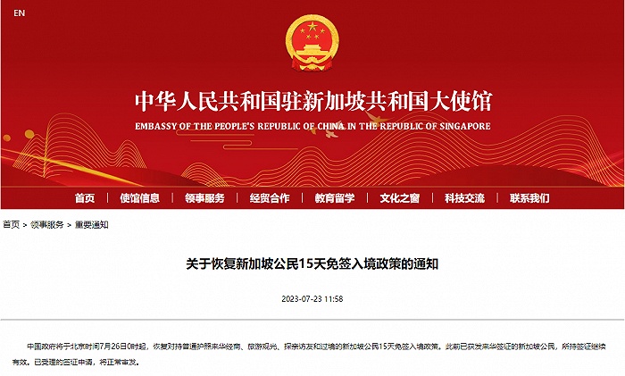 央視網(wǎng)消息:據(jù)中國駐新加坡大使館網(wǎng)站消息,中國政府將于北京時間7月26日0時起,恢復對持普通護照來華經(jīng)商、旅游觀光、探親訪友和過境的新加坡公民15天免簽入境政策。此前已獲發(fā)來華簽證的新加坡公民,所持簽證繼續(xù)有效。已受理的簽證申請,將正常審發(fā)。