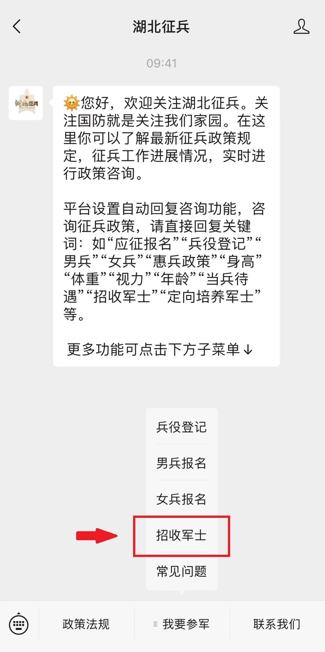 也可以關(guān)注“湖北征兵”,點擊子菜單“我要參軍”→“招收軍士”進(jìn)行網(wǎng)上報名。