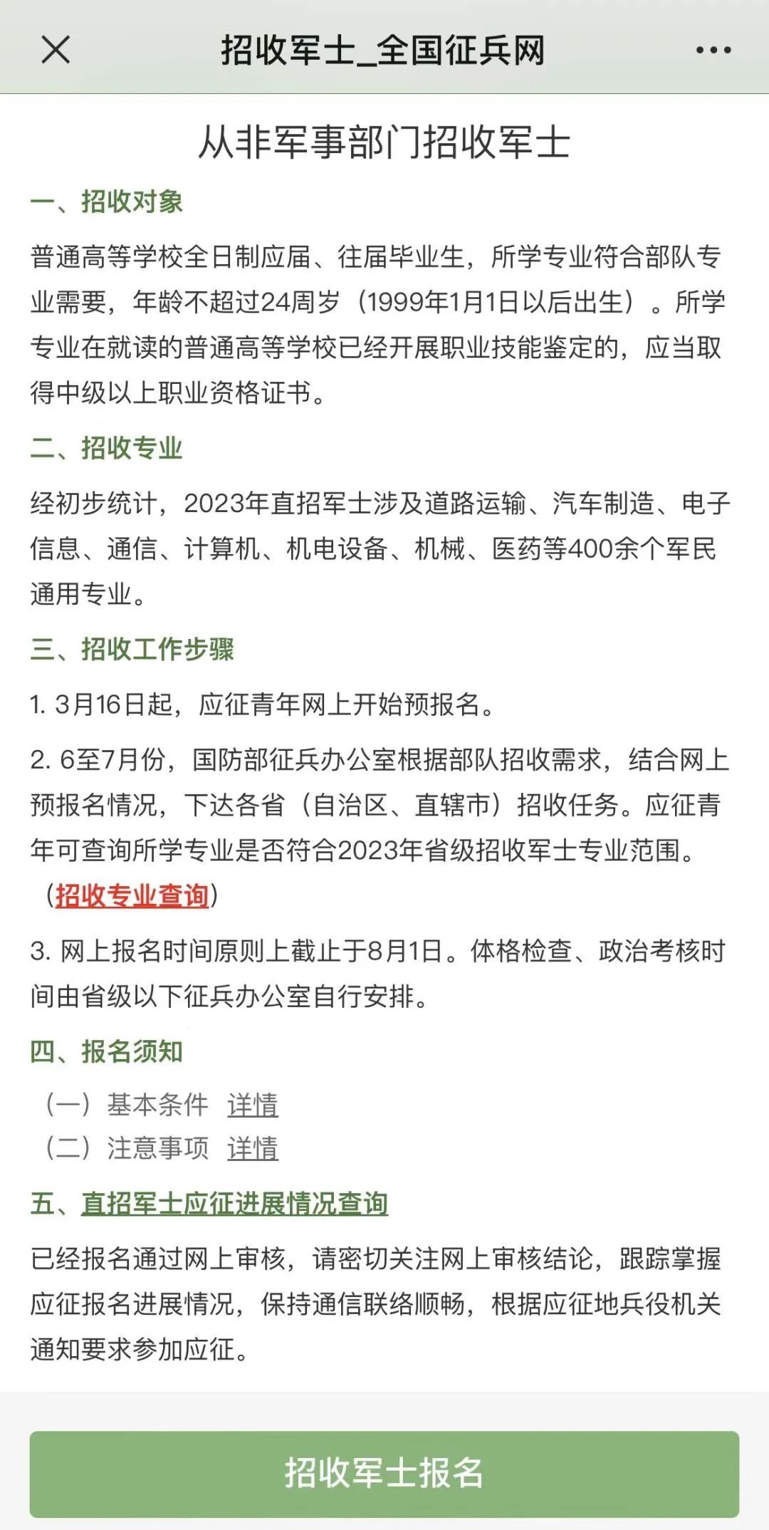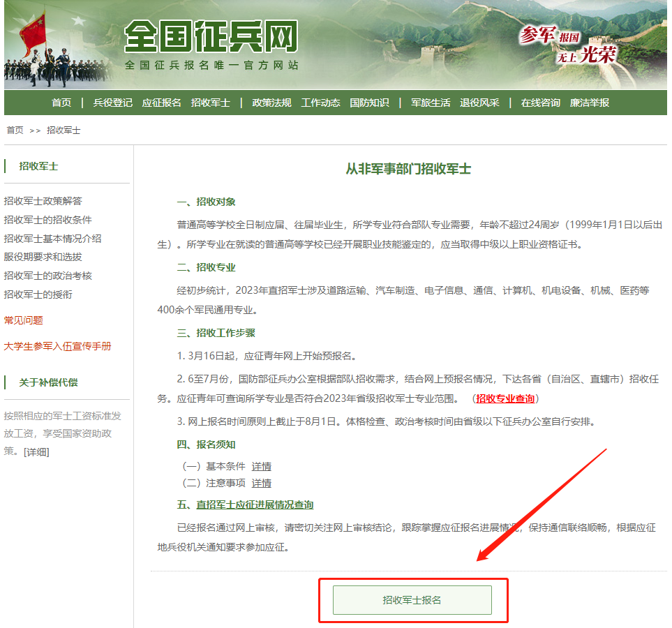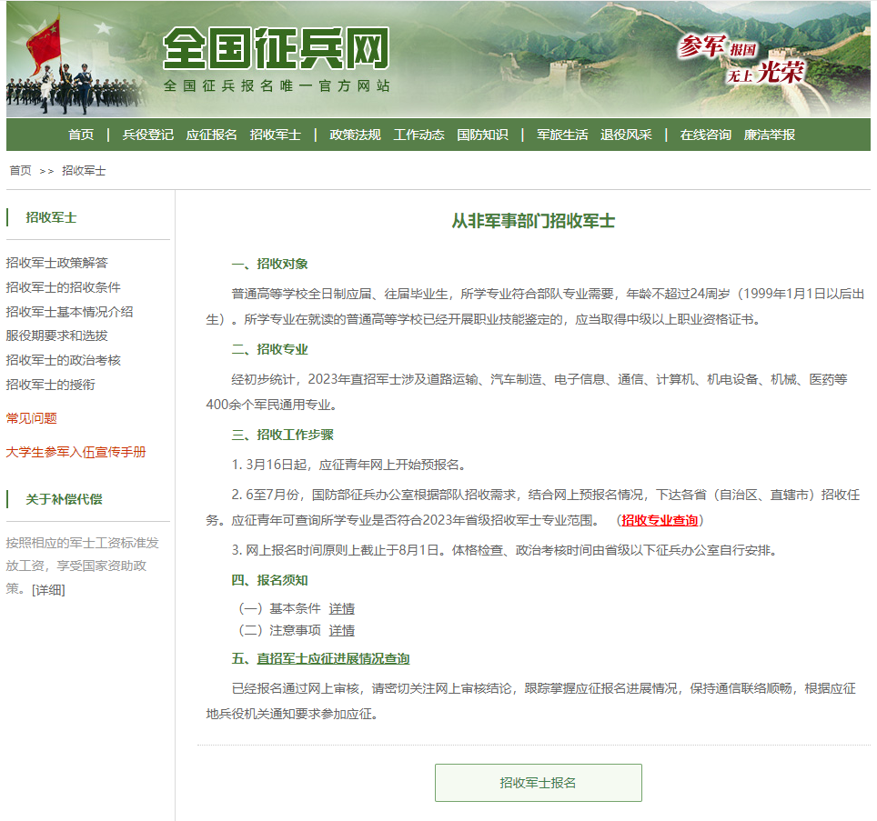 采取網(wǎng)上報名的方式,應(yīng)征青年登錄“全國征兵網(wǎng)”,點擊“招收軍士報名”查詢招收專業(yè)并進(jìn)行報名。