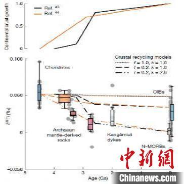 大陸地殼生長模型和地球地幔來源火成巖的鈦穩(wěn)定同位素組成隨時間的演化。中國科學技術大學 供圖