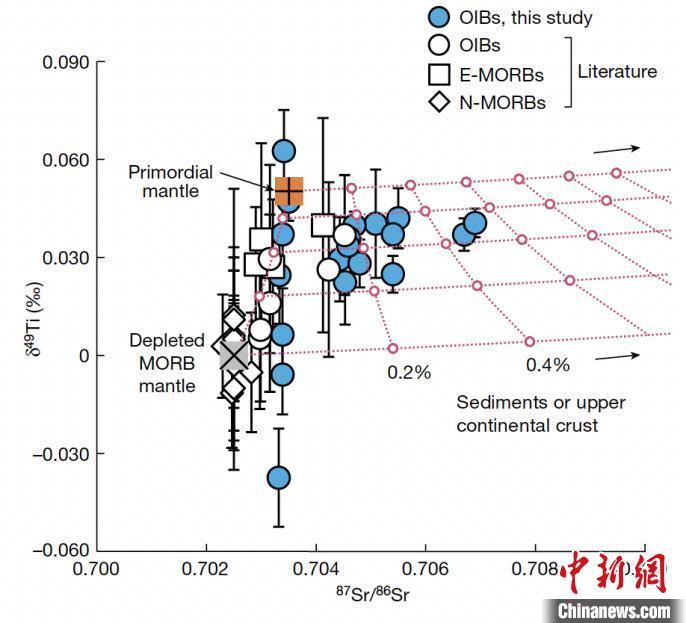 現(xiàn)代洋島玄武巖和大洋中脊玄武巖的鈦穩(wěn)定同位素和鍶同位素組成。中國科學技術大學 供圖